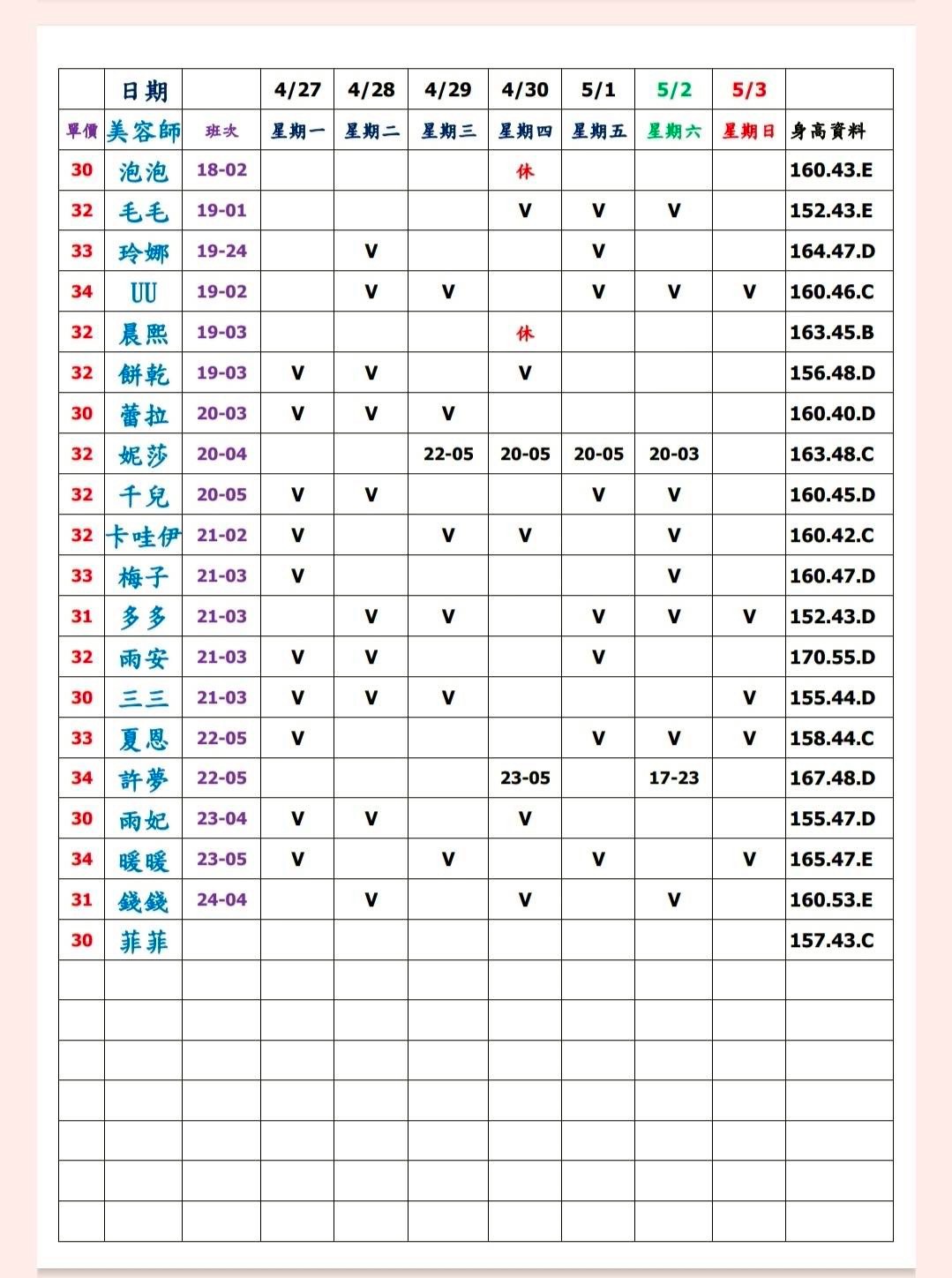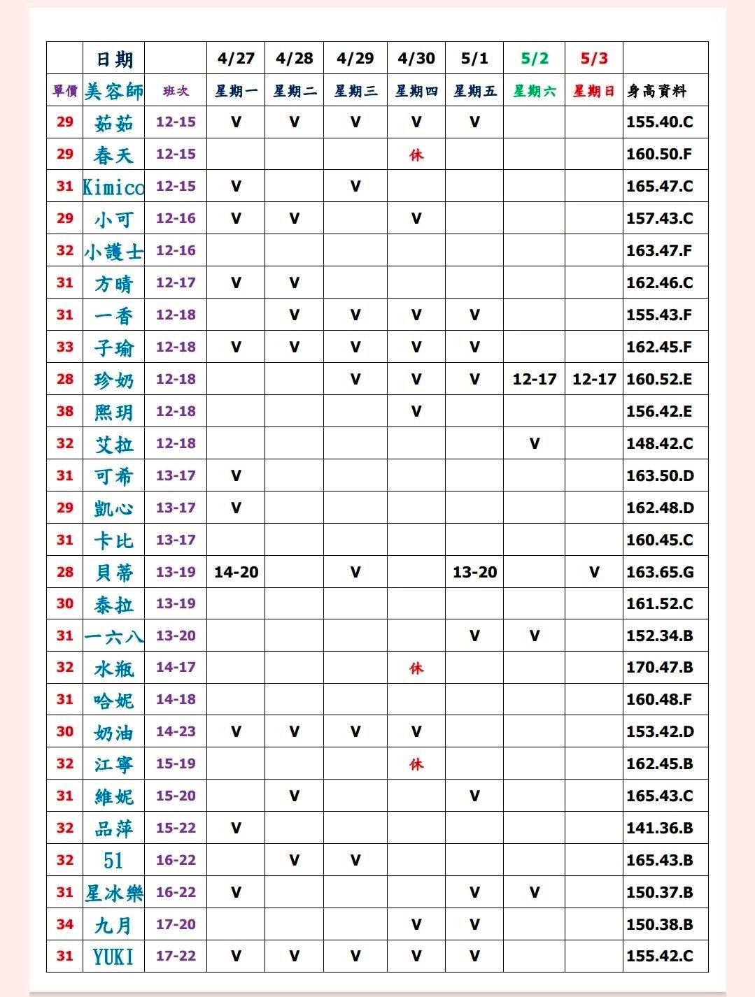 有打勾即報班,若是寫時段,代表當日為該上班時段