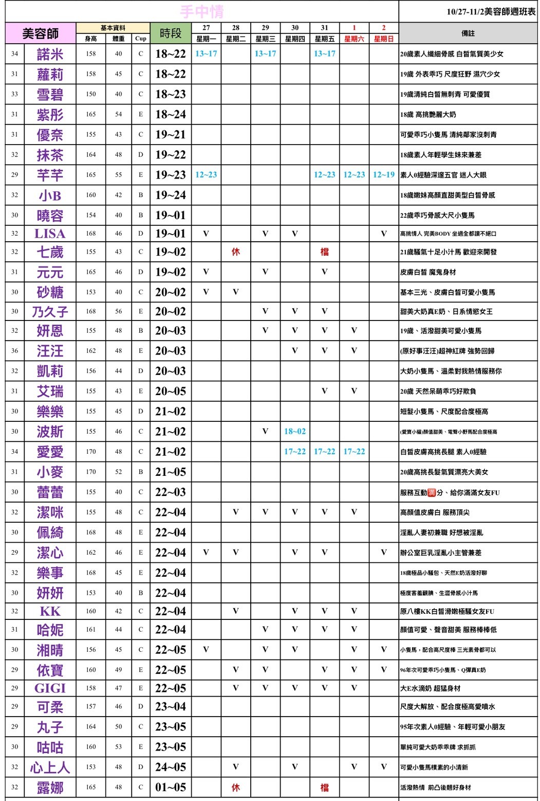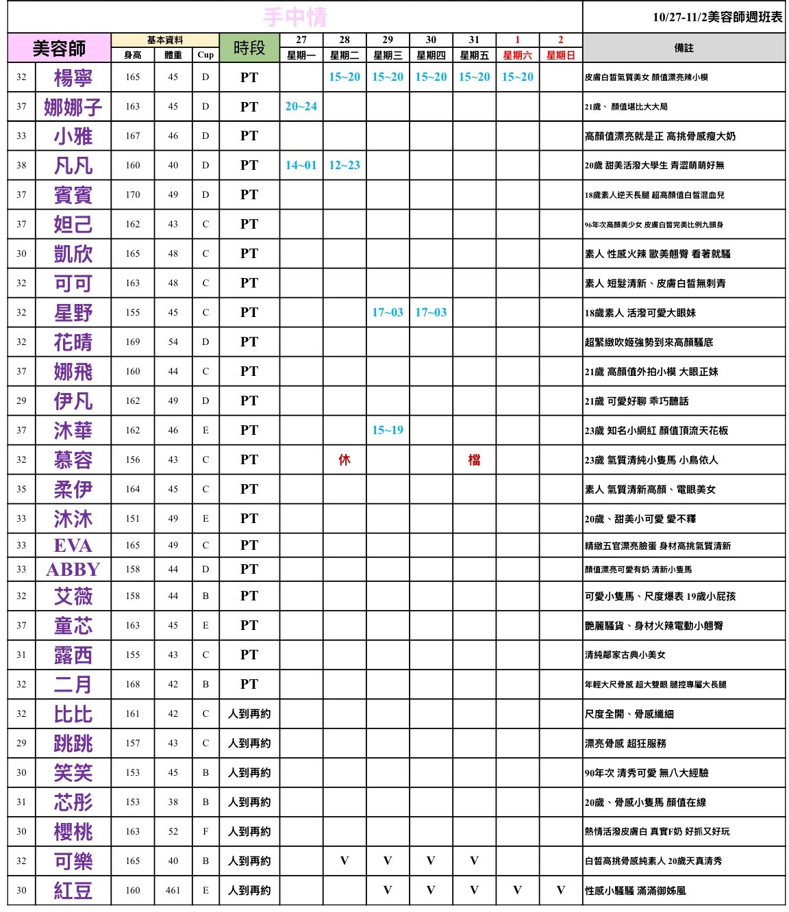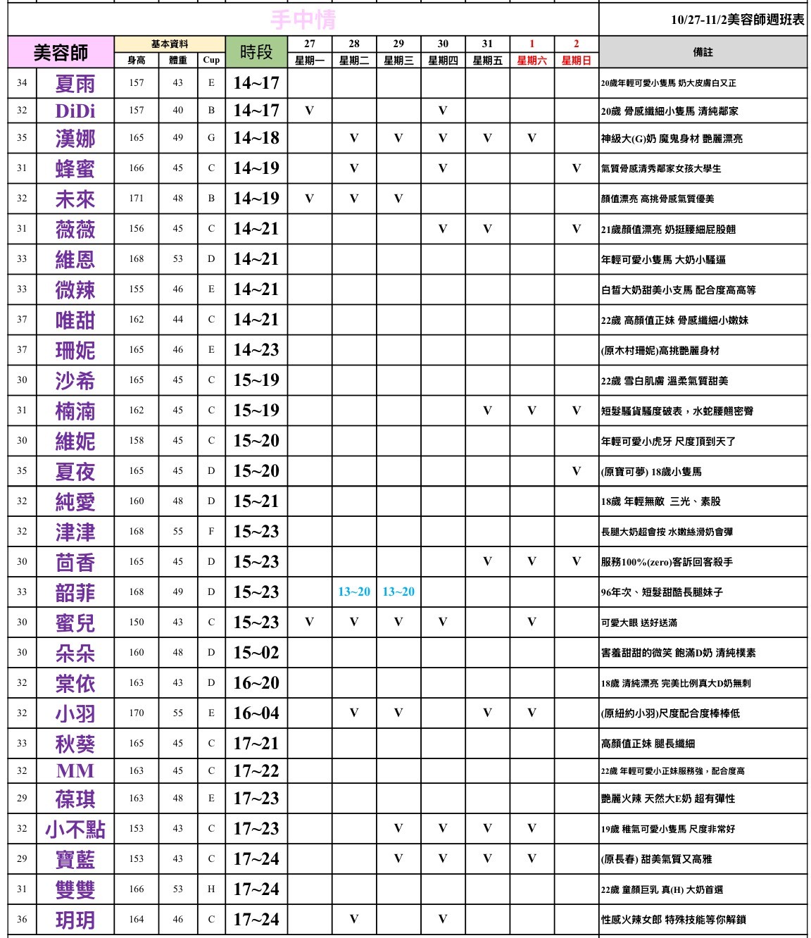 班表最左邊欄位: (27)檯費2700~ (28)檯費2800