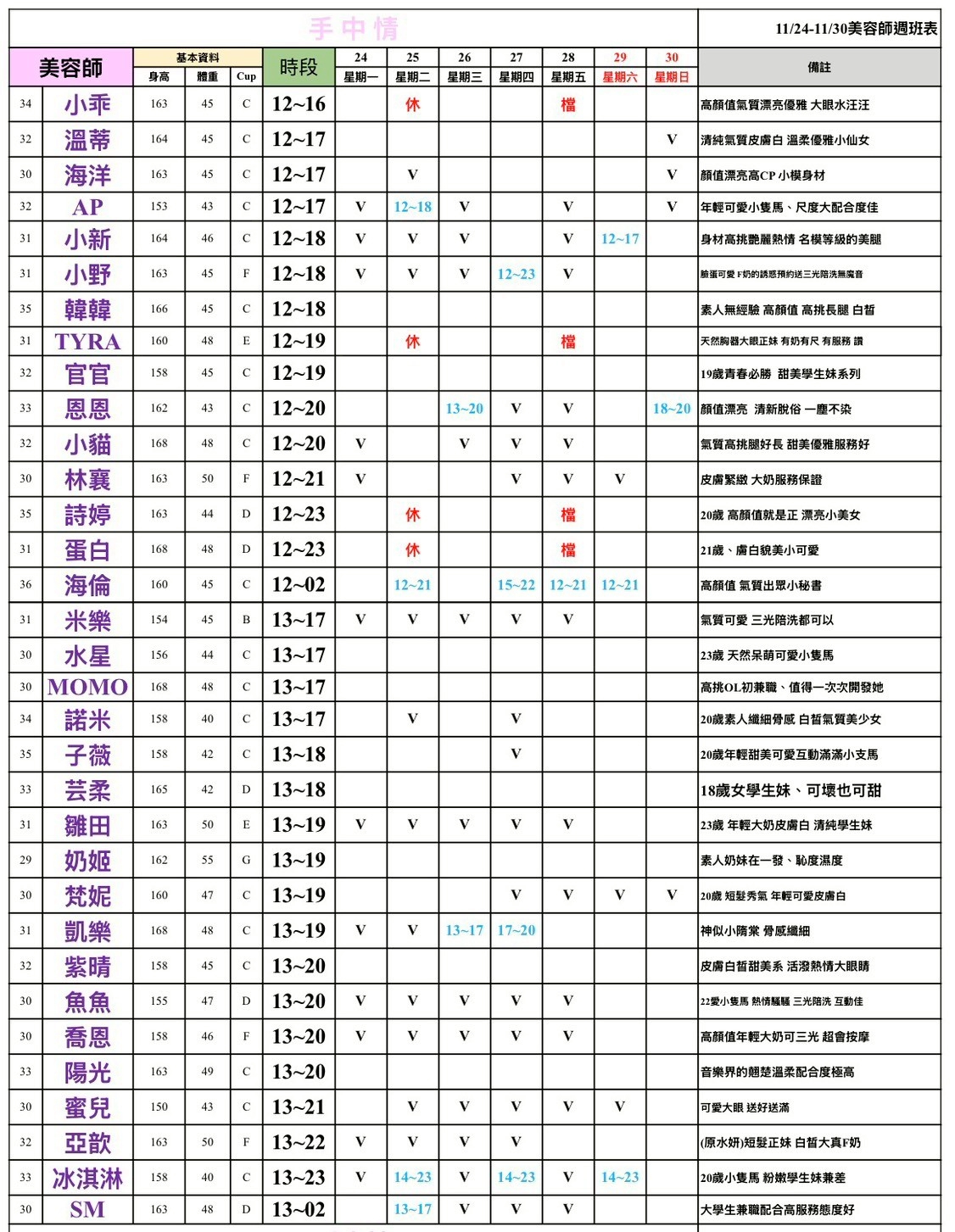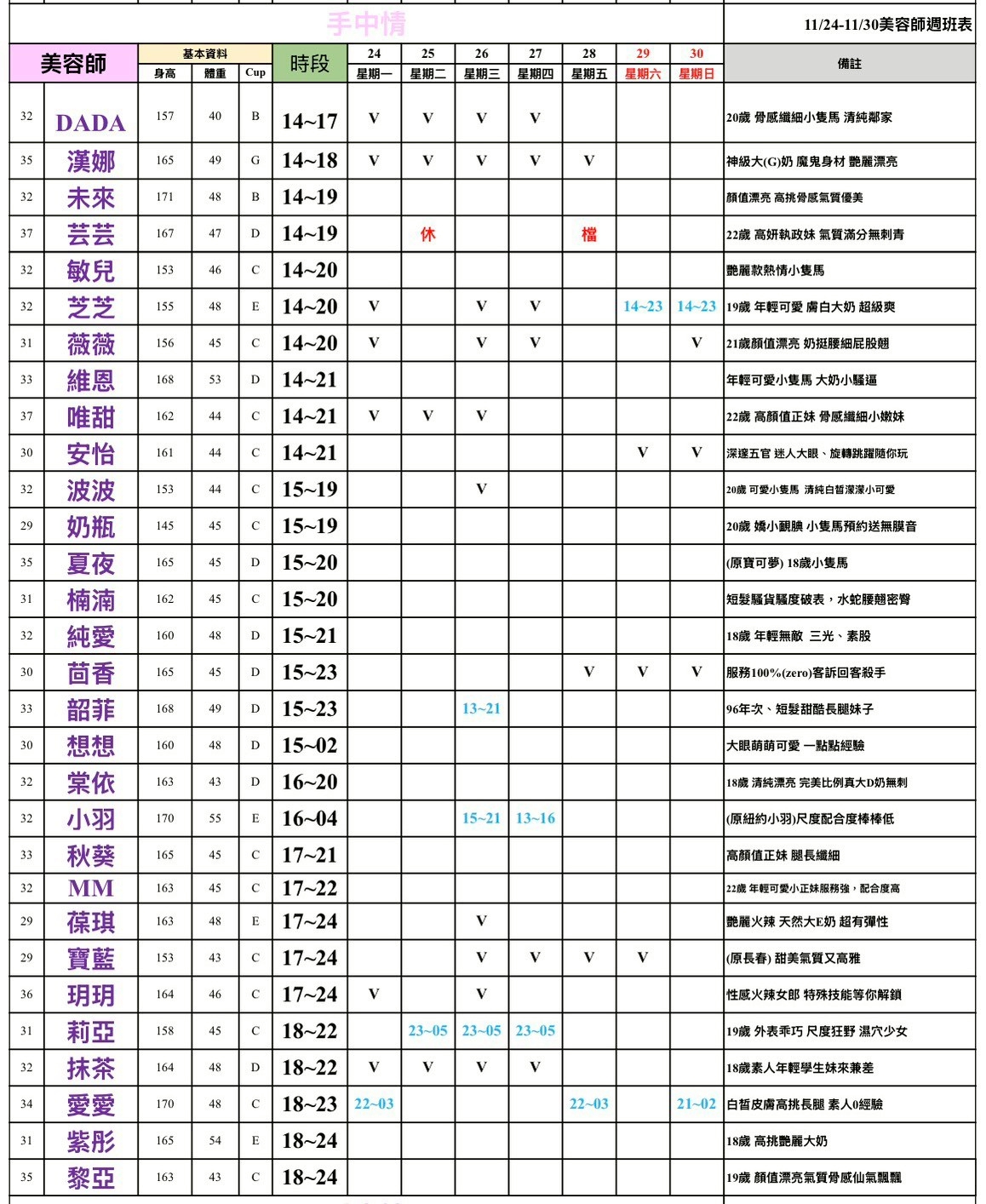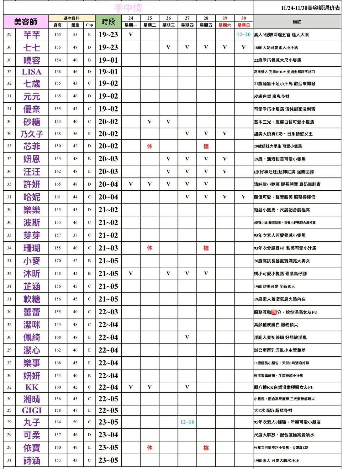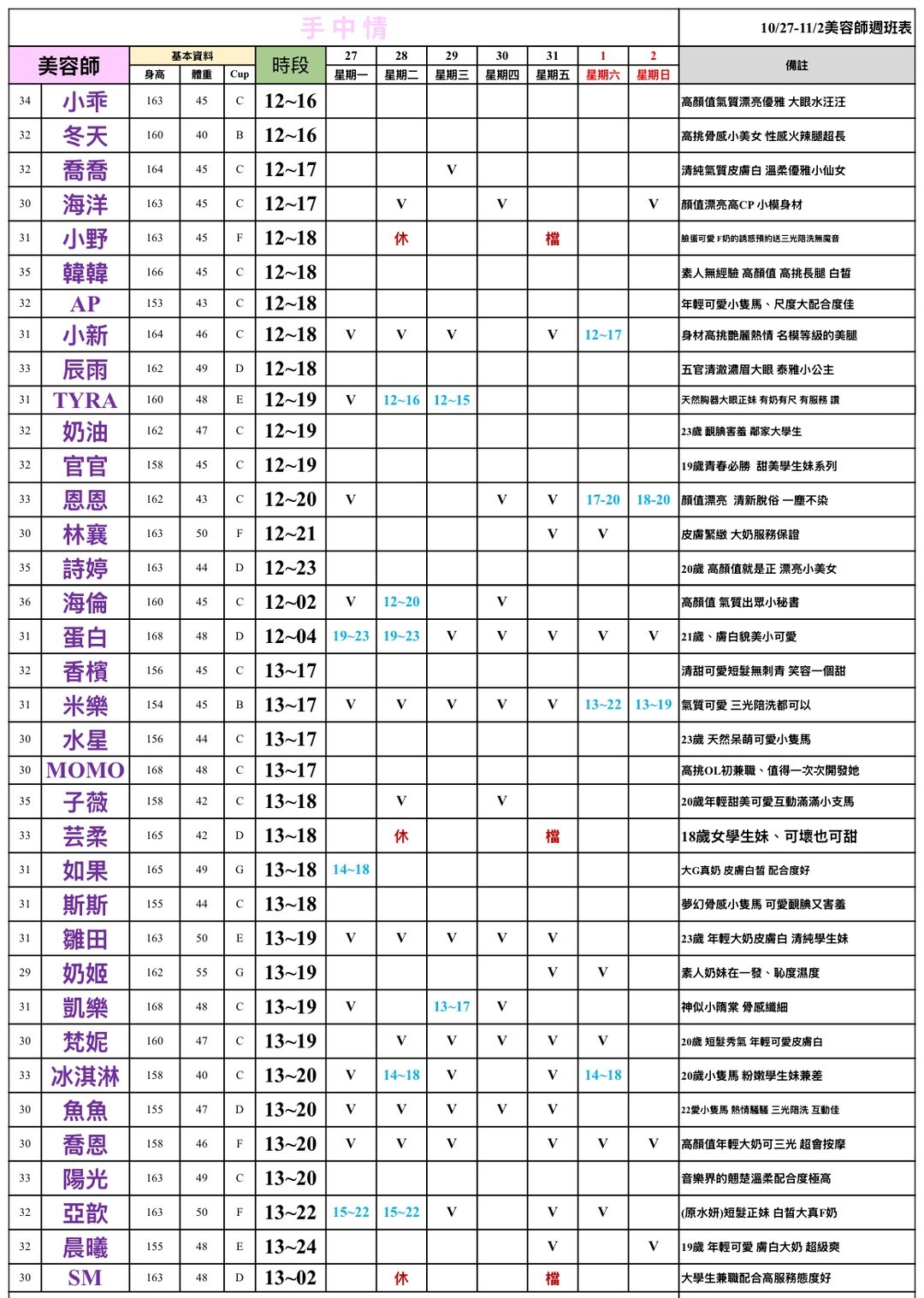 班表最左邊欄位: (27)檯費2700~ (28)檯費2800