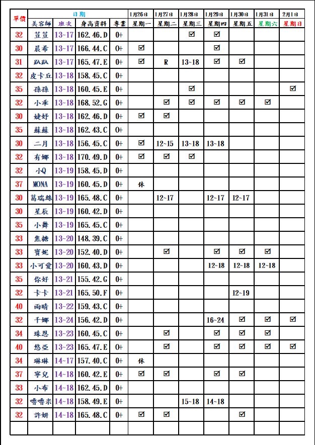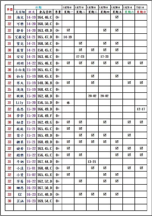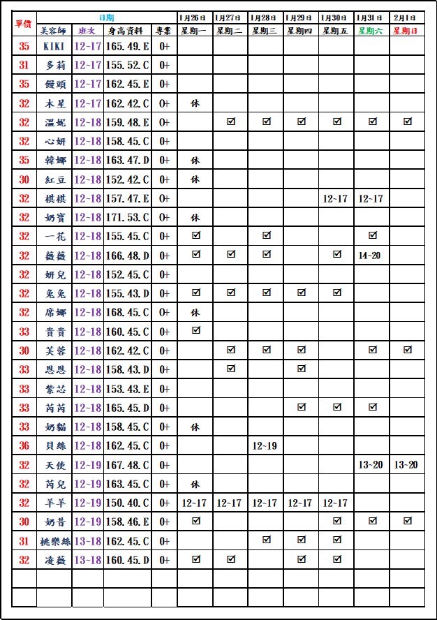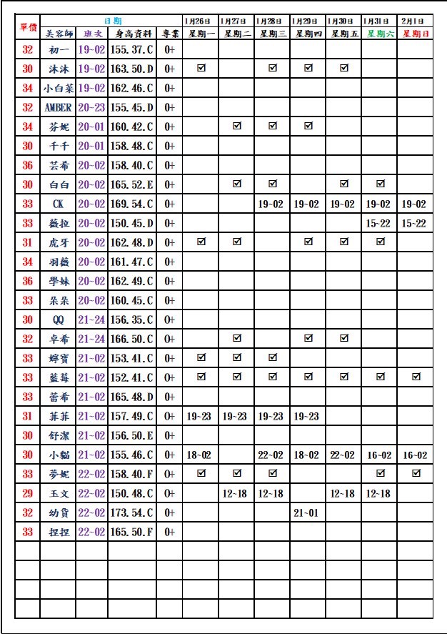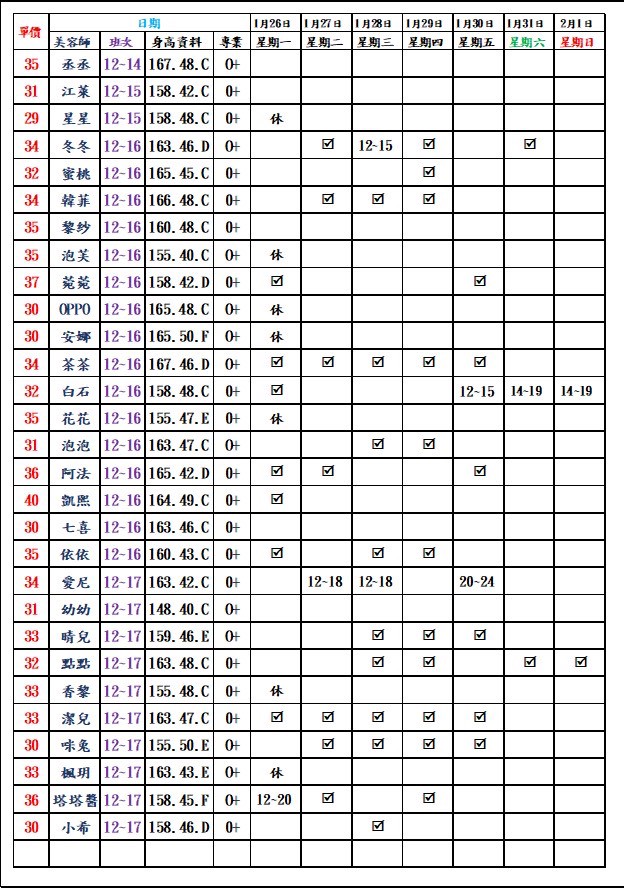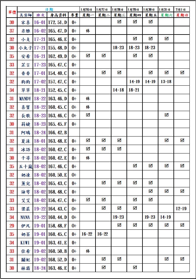 有打勾即報班,若是寫時段,代表當日為該上班時段